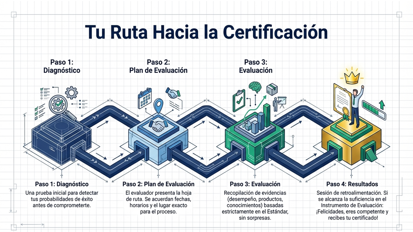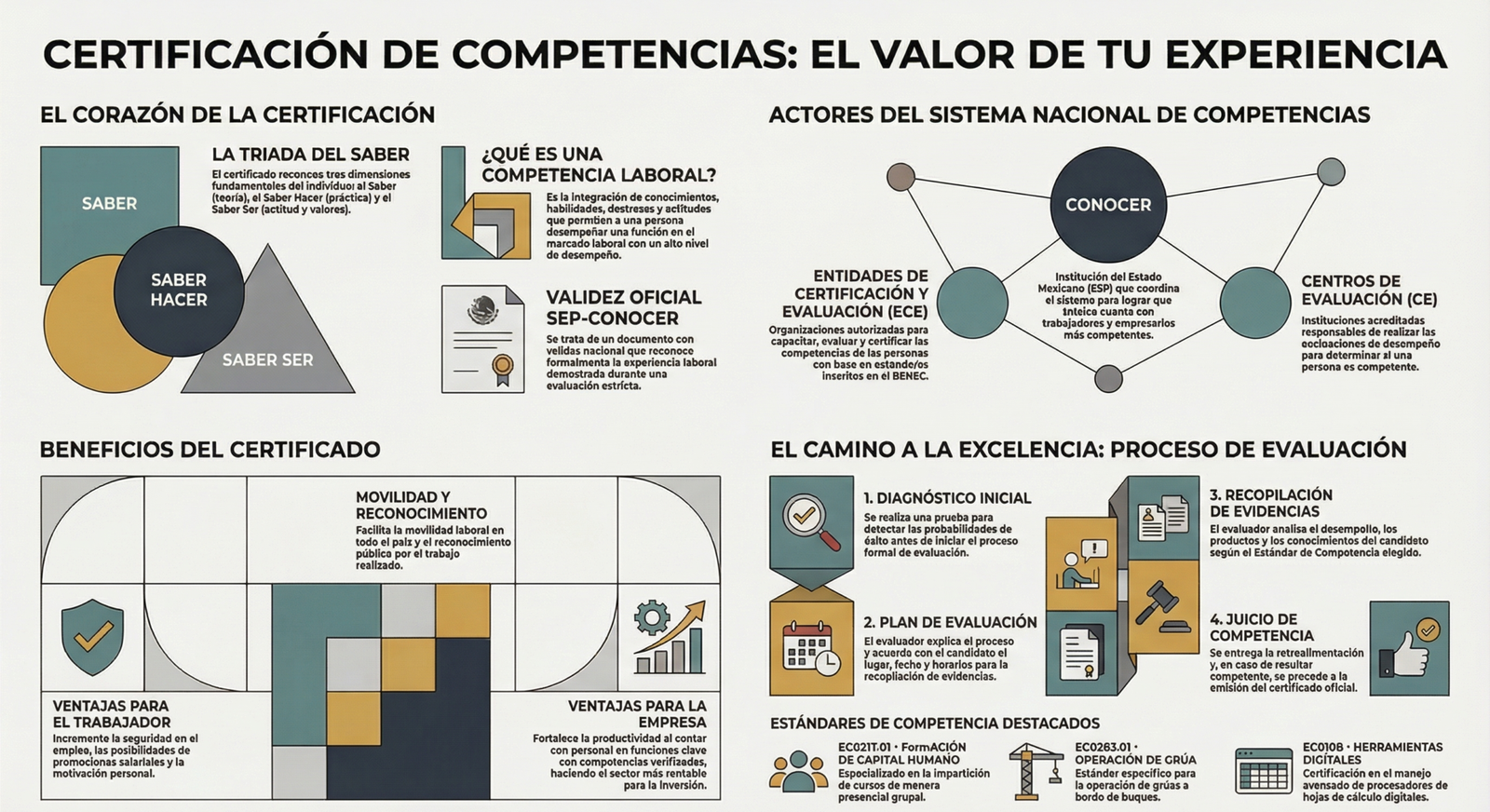 Esta certificación se basa en un Estándar de Competencia registrado en el Registro Nacional de Estándares de Competencia, y se obtiene después de un proceso de evaluación en el que la persona demuestra su experiencia y dominio, sin importar si lo adquirió en el trabajo, en la escuela o de manera empírica.