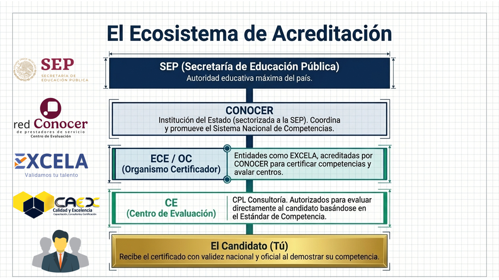 La certificación de competencia es un proceso mediante el cual un organismo autorizado, independiente y reconocido por el CONOCER (Consejo Nacional de Normalización y Certificación de Competencias Laborales), valida y reconoce oficialmente que una persona posee los CONOCIMIENTOS, HABILIDADES Y ACTITUDES necesarias para desempeñar una función laboral con calidad.